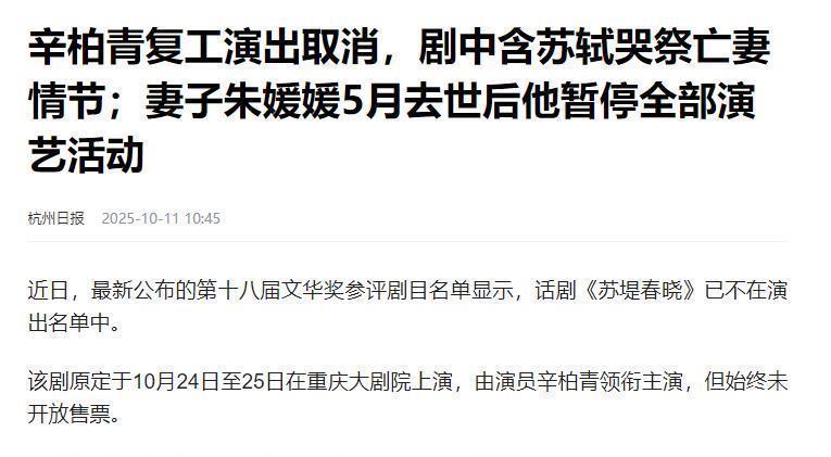 10日,重庆大剧院发出消息:辛柏青复工演出取消了。此前就有消息称,辛柏青将在十月下旬复工演出。演出项目是《苏堤春晓》。这是辛柏青妻子朱媛媛去世后,辛柏青第一次有复工的消息。因此受到了广泛关注,不少人早就做好准备去现场观看了。可在前不久,有人发现该项目的售票程序一直没打开。便开始怀疑,演出会不会取消了,这次重庆大剧院的发声,算是证实。对于取消原因,剧院给出的原因是《苏堤春晓》已经不在文华奖参评剧目中了。这个原因,网友似乎并不认可。文华奖作为大奖项,参评剧目大概率不会在演出前不久随意更改。因此网友认为,演出取消肯定另有原因。结合《苏堤春晓》的题材,也不禁令人想到,辛柏青是不是还没从亡妻的悲痛中走出来。因为这部剧是苏轼纪念亡妻时所做,这与辛柏青刚刚失去妻子的境遇相似。如果辛柏青演出时情绪崩溃,很有可能造成不好的影响。而恰逢如今的辛柏青真的没有走出来的话,其实是不适合演出的。因此网友的猜测其实不无道理。除此之外,还有网友呼吁辛柏青:别演了,大方说出来,自己还没从亡妻的悲痛中走出来!自从朱媛媛去世后,辛柏青就暂停了一切活动,可见他是真的很伤心。那么大家认为,此次演出取消是因为什么呢?